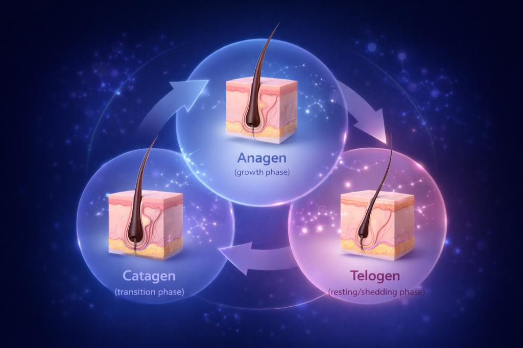 Hormones regulate how long hair stays in the growth phase. When hormonal imbalance occurs, more hairs enter the telogen phase prematurely, leading to excessive shedding — a condition called telogen effluvium.